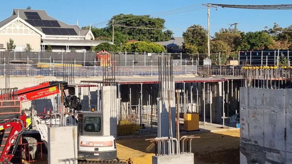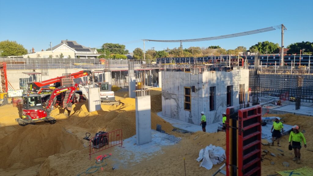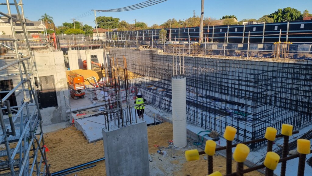 Pouring of the basement slab has commenced, with progress made in the northern corners of the basement. Preparation for subsequent slab pours is ongoing, including trimming, compaction and installation of in-ground services beneath the slab.