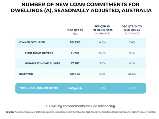 The latest Australian Bureau of Statistics data show the number of new loan commitments (excluding refinancing) in the December 2025 quarter was 13.4% higher than a year earlier. Under the surface: