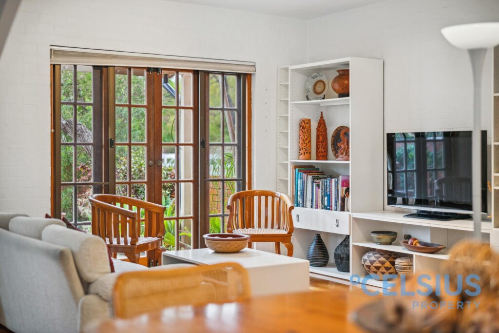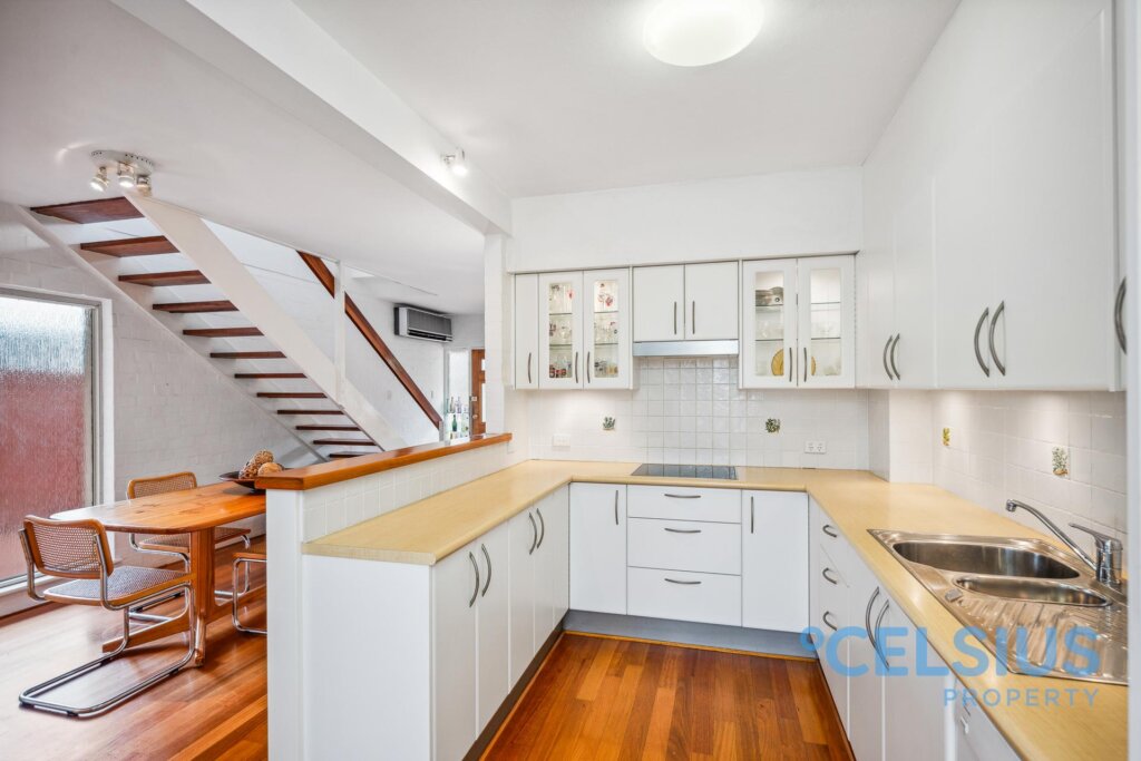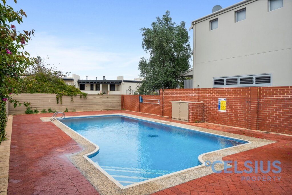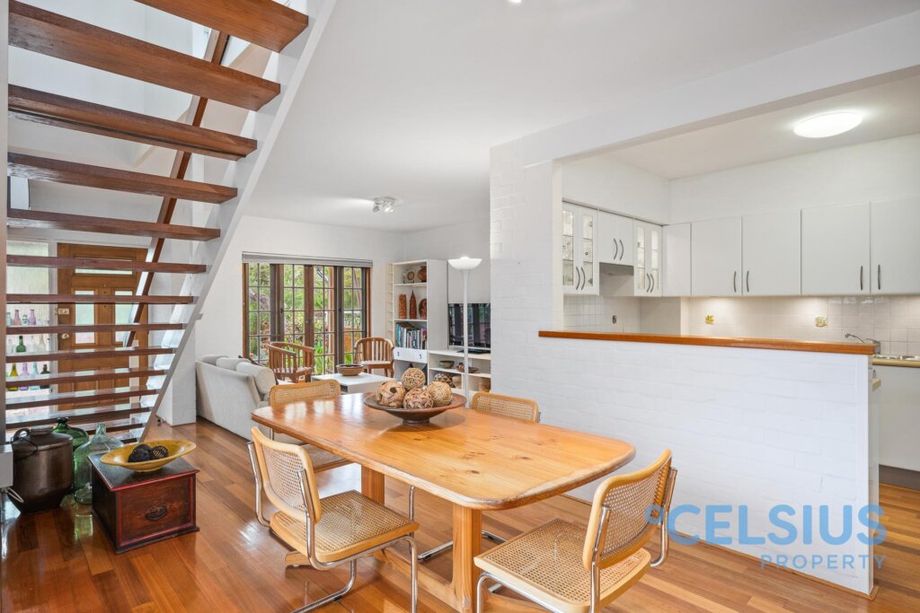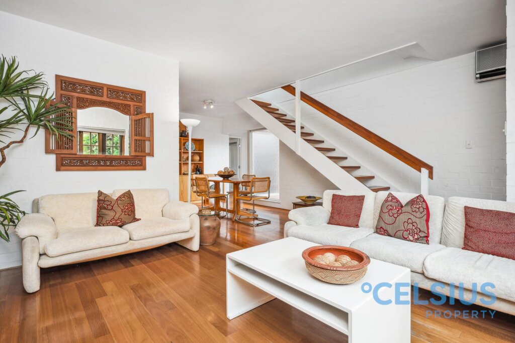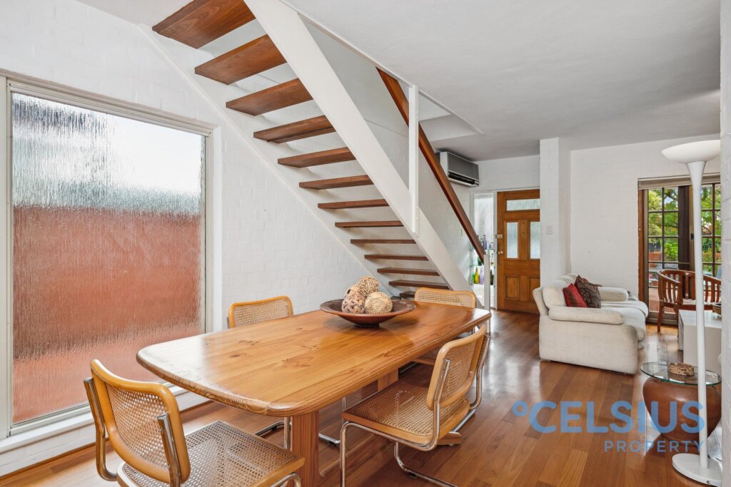 The open-plan living area on the ground floor features beautiful timber flooring throughout and a stunning Jarrah staircase. Entertaining is a dream with open plan living and charming French doors opening onto the front courtyard, seamlessly connecting indoor and outdoor living. The kitchen leads to your own private rear courtyard – a perfect retreat with direct access to the pool area.