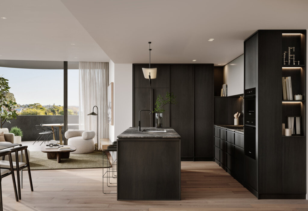 The residences cater to various lifestyles, with larger spaces for downsizers and compact configurations for professionals. Open-plan living areas are bright and expansive with full-height sliding doors connecting to outdoor spaces, designed to optimise natural light and cross-flow ventilation. Large openings on the façade enhance the connection to the outdoors, supporting efficient, vibrant and flexible living. With the enviable option to select between four design schemes, the kitchen also features premium appliances, bespoke island bench and seamlessly integrated storage, setting the stage for crafting exquisite meals.