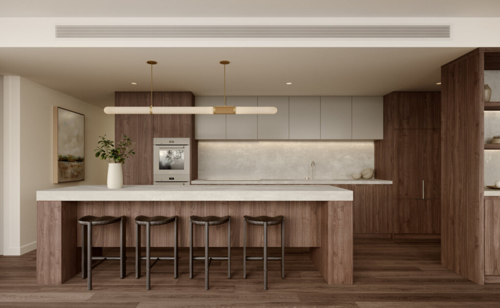 All apartments and town homes include Miele double ovens, integrated dishwasher, induction cooktop, range hood and a fully integrated Fisher & Paykel Fridge Freezer as standard. Engineered timber boards to living areas, fully ducted zoned heating and cooling, keyless smart building and number plate recognition as well as smart mail lockers amongst the enviable features.