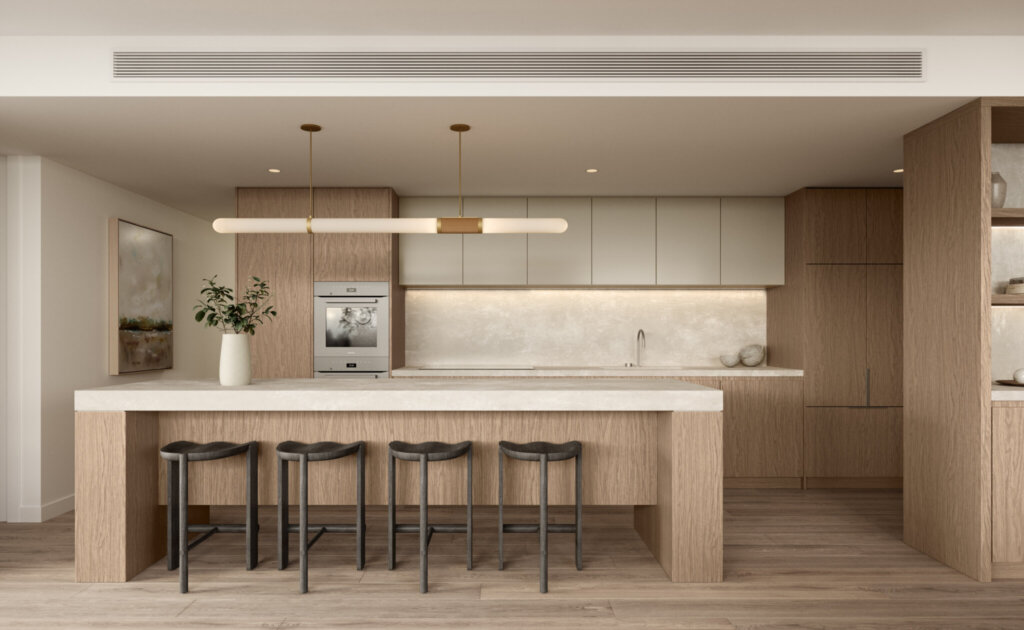 All apartments and town homes include Miele double ovens, integrated dishwasher, induction cooktop, range hood and a fully integrated Fisher & Paykel Fridge Freezer as standard. Engineered timber boards to living areas, fully ducted zoned heating and cooling, keyless smart building and number plate recognition as well as smart mail lockers amongst the enviable features.