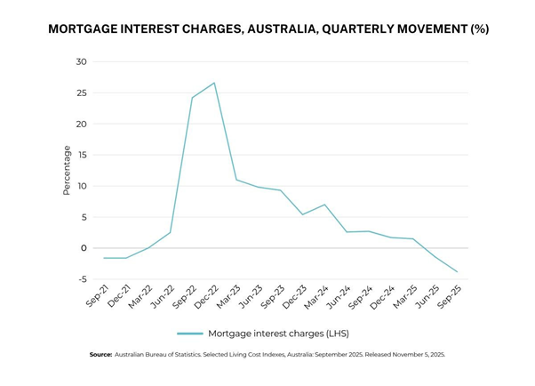 The Australian Bureau of Statistics reports mortgage interest costs dropped 1.4% in the June quarter and another 3.8% in the September quarter, helped by three rate cuts earlier this year.
